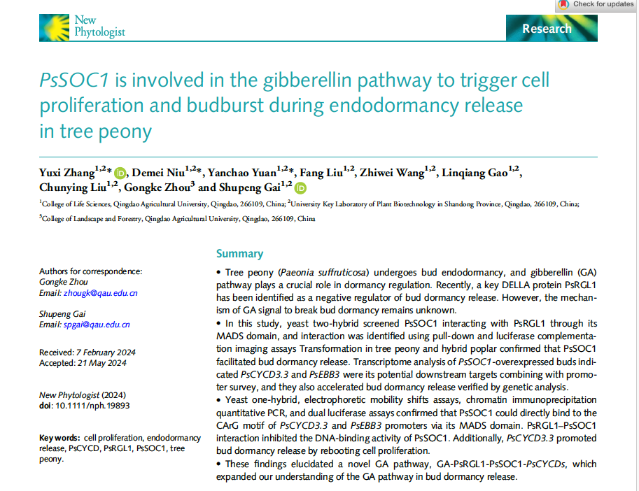 近日,BEAT365唯一官网盖树鹏、园林与林学院周功克团队合作在New Phytologist上发表了题为“PsSOC1 is involved in the gibberellin pathway to trigger cell proliferation and budburst during endodormancy release in tree peony”的研究论文。该研究发现了一种GA信号的新途径,解析了牡丹PsSOC1作为GA信号的重要组分通过重启细胞周期调控芽休眠解除的分子机制。
