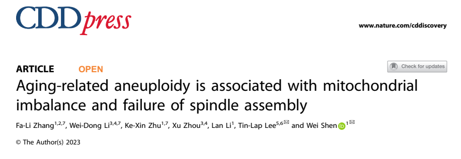 近日,细胞生物学权威杂志《Cell Death Discovery》在线发表了BEAT365唯一官网沈伟教授课题组题目为“Aging-related aneuploidy is associated with mitochondrial imbalance and failure of spindle assembly”的研究论文。