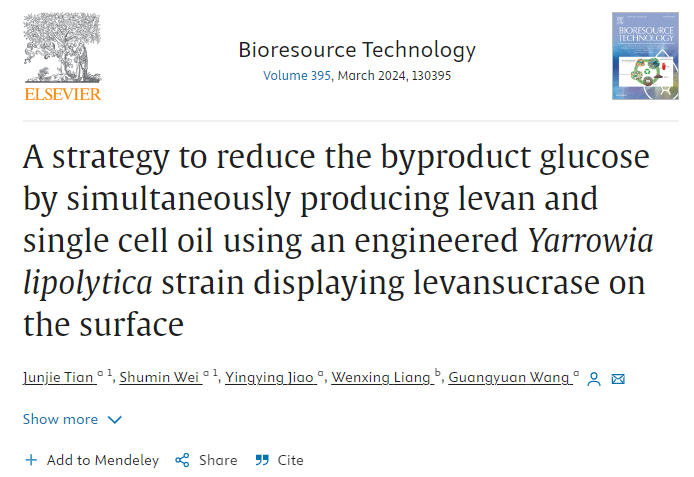 近日,BEAT365唯一官网王光远副教授课题组在生物工程领域TOP期刊Bioresource Technology(影响因子11.4,中科院1区)发表了题为“A strategy to reduce the byproduct glucose by simultaneously producing levan and single cell oil using an engineered Yarrowia lipolytica strain displaying levansucrase on the surface”的研究论文。