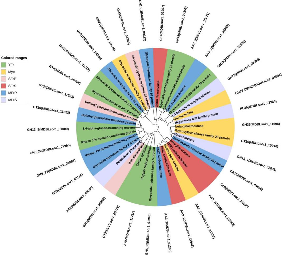 野生花脸香蘑是一种珍稀食药用菌,通过人工驯化获得了一株营养丰富、风味良好、铁含量高的优良菌株,并首次实现了其大规模栽培。文章2利用高通量比较蛋白质组学技术,揭示了该驯化菌株在早期子实体形成过程中原基分化的调控机制,表明原基分化前主要受线粒体功能相关蛋白和调节体内二氧化碳浓度蛋白的影响,原基形成后早期分化主要受与细胞组分生成、细胞增殖、氮化合物代谢、核苷酸代谢、谷胱甘肽代谢和嘌呤代谢相关的蛋白调控。同时,文章还揭示了菌柄和菌盖的不同发育调控模式,调节菌盖生长发育的蛋白主要与转录、RNA剪接和各种细胞器,尤其线粒体膜成分,生成相关,调控菌盖成熟的蛋白主要与DNA构象变化、核小体组织、蛋白质加工、成熟和运输、细胞解毒等过程相关;调节菌柄生长发育的蛋白主要与碳水化合物代谢和能量代谢过程相关,当大量的细胞质部分被废弃,且与营养剥夺和外界刺激相关的蛋白高表达时预示着菌柄的成熟。