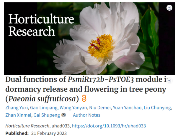 近日,BEAT365唯一官网盖树鹏团队在农林科学领域一区、Top期刊《Horticulture Research》上发表了题为“Dual functions of PsmiR172b-PsTOE3 module involving in regulation dormancy release and flowering in tree peony (Paeonia suffruticosa)”的研究成果。该研究从microRNA对靶基因调控的角度,解析了PsmiR172与靶基因PsTOE3调控牡丹芽休眠解除和开花的双重功能。