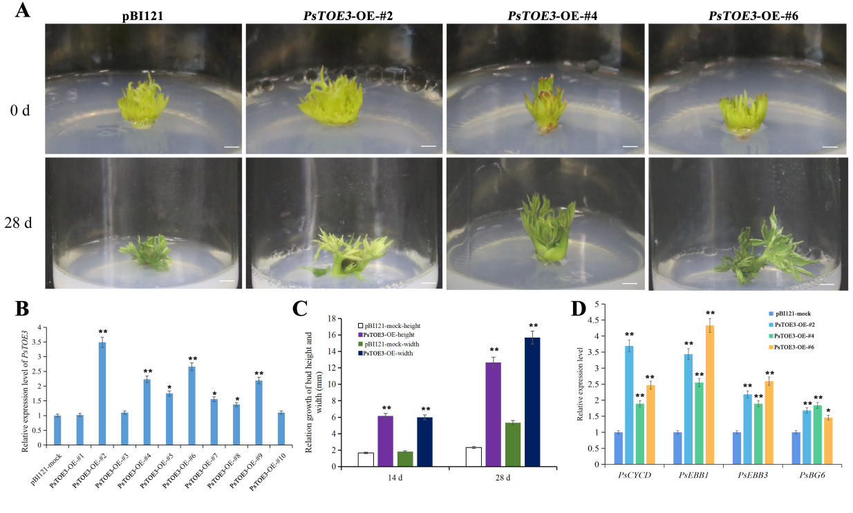 图1 牡丹芽中超表达PsTOE3促进了芽休眠解除及萌动