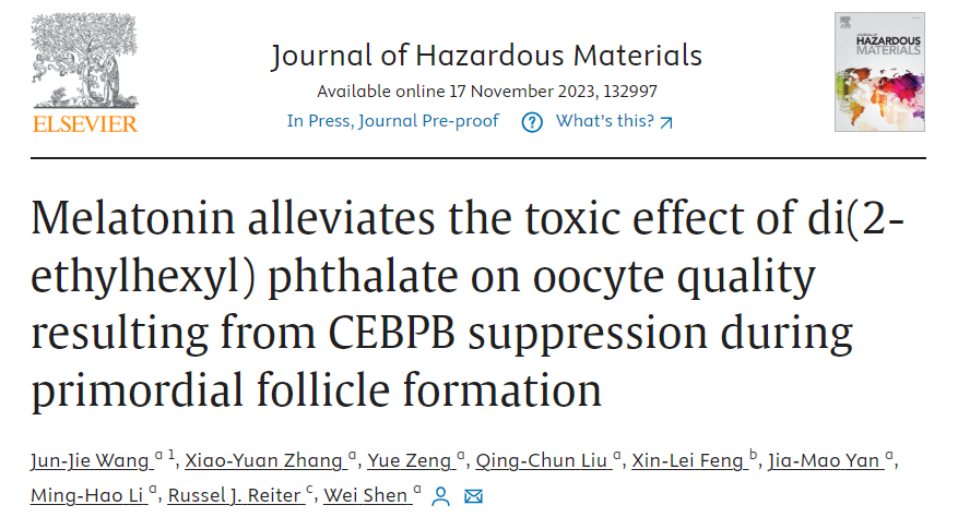 近日,BEAT365唯一官网沈伟教授课题组在动物卵母细胞发育方面取得重要进展,相关成果以“Melatonin alleviates the toxic effect of di(2-ethylhexyl) phthalate on oocyte quality resulting from CEBPB suppression during primordial follicle formation”为题,在线发表于《Journal of Hazardous Materials》(一区top期刊,IF=13.6)杂志上。