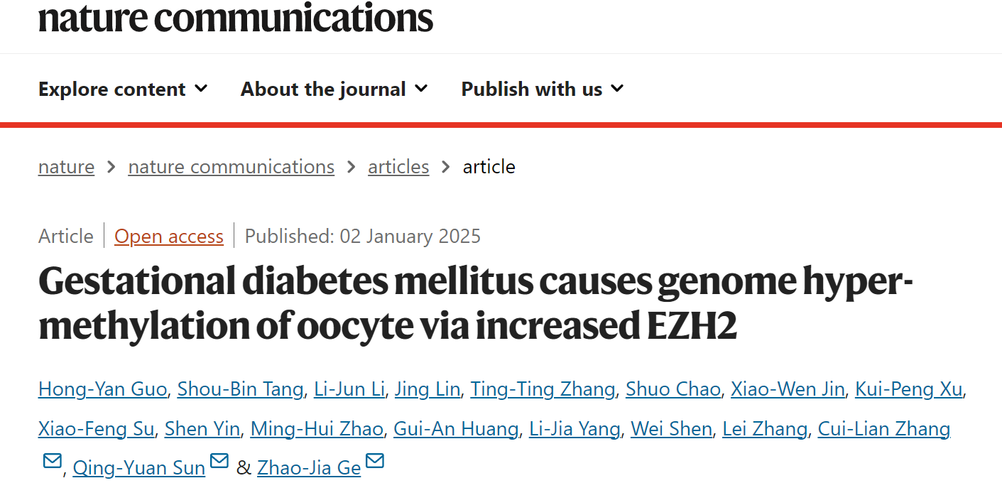 近日,BEAT365唯一官网葛照嘉教授团队、广东省第二人民医院孙青原教授团队和河南省人民医院生殖中心张翠莲教授团队合作,在Nature Communications杂志发表题为Gestational diabetes mellitus causes genome hyper-methylation of oocyte via increased EZH2的研究论文,揭示了妊娠糖尿病引起子代卵子EZH2基因高表达,通过募集DNA甲基转移酶DNMT1入核介导卵母细胞高甲基化,从而造成后代代谢异常的跨代遗传效应。