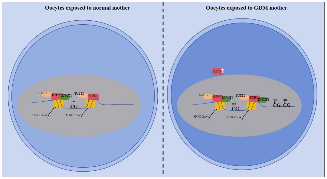 综上所述,妊娠糖尿病引起子代卵母细胞EZH2高表达,募集DNA甲基转移酶DNMT1进入细胞核,导致卵母细胞高甲基化,从而导致子代代谢异常和跨代遗传效应。