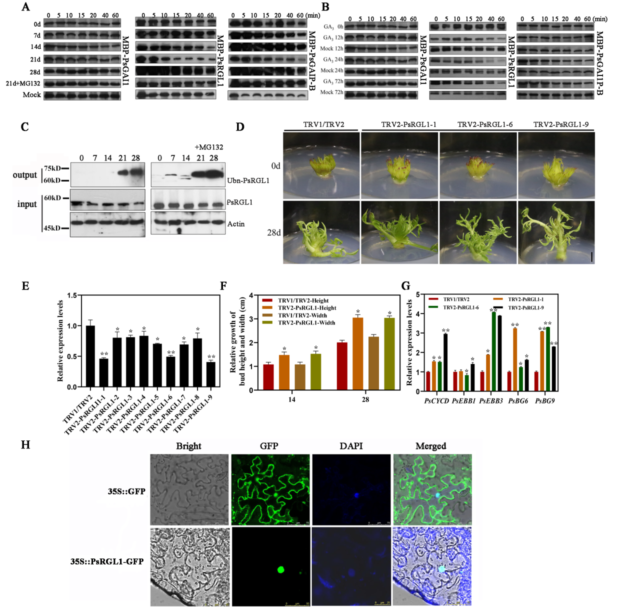 该研究筛选鉴定了在低温及外源赤霉素诱导的芽休眠解除中蛋白水平极显著下调的DELLA成员PsRGL1,并检测到强的泛素化信号。沉默牡丹芽中的PsRGL1,通过表型观察及芽休眠解除的marker基因的表达变化发现PsRGL1为芽休眠解除的负调控因子(图1)。进一步,作者发现牡丹PsF-box1基因相应低温及外源赤霉素处理促进了芽休眠解除。该基因编码E3泛素连接酶的重要组分GID2,酵母双杂交和BiFC结果表明PsF-box1蛋白与PsRGL1结合。已有研究表明GA途径是牡丹芽休眠解除的内因,该研究鉴定了牡丹芽休眠解除中GA途径的重要成员,其中包括发生泛素化降解的DELLA蛋白(PsRGL1),和E3泛素连接酶的重要组分F-box蛋白,并明确了它们在芽休眠解除中的功能。研究结果为深入研究GA途径参与芽休眠解除的分子机制提供了坚实的理论基础,也为牡丹花期分子育种提供优质的基因资源。