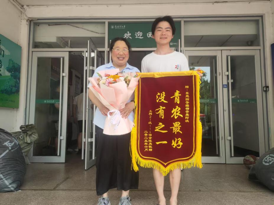 “薪火循光”的传承理念在毕业生离校环节熠熠生辉。毕业生们主动践行文明离校承诺,打扫干净每一间宿舍,为学弟学妹留下整洁的“文化培养基”。宿舍内,鲜花与“情系生科,执梦远航”的祝福语,构筑起温暖的“文明染色体”。4号楼毕业生陈禹为楼管吴阿姨送上锦旗的一幕,更是将这份感恩与传承推向高潮,后勤服务与学生感恩共同编织出学院温暖和谐的育人生态,让文明传承的力量生生不息。