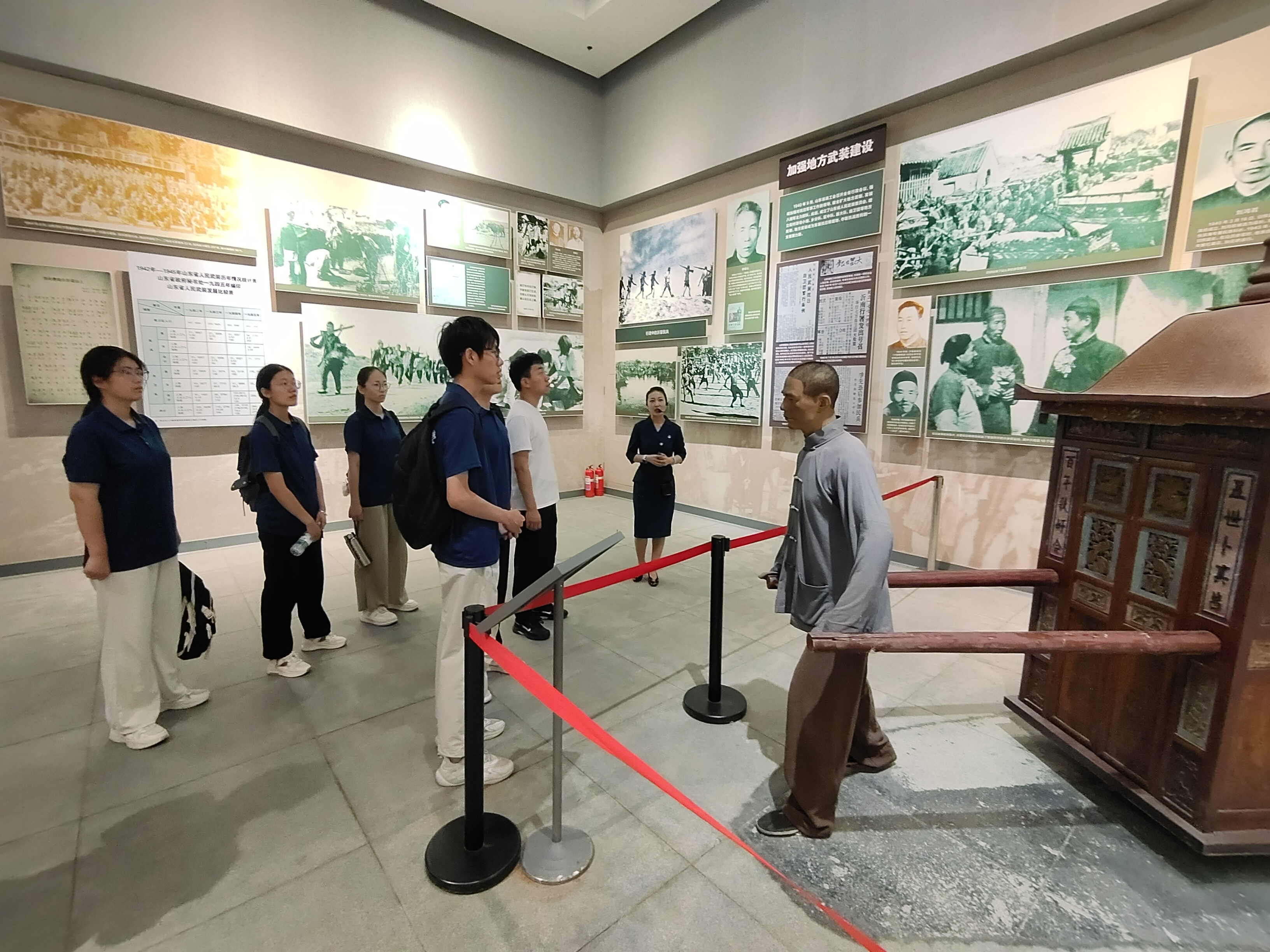 为追寻革命足迹,团队探访了东高庄村。这里是《跟着共产党走》红歌诞生地。队员们在走访的过程中,了解了《跟着共产党走》的诞生背景,学习并歌唱这首红歌。在山东抗日民主政权创建纪念馆,跟随讲解员的脚步,队员们系统学习了山东根据地艰苦卓绝的奋斗史,深刻体悟“党群同心、军民情深、水乳交融、生死与共”的沂蒙精神内核。“红歌在这里唱响,精神在这里孕育。作为新时代青年,我们必须让这红色血脉永续流淌!”实践团队长彭宇航在参观后坚定地表示。