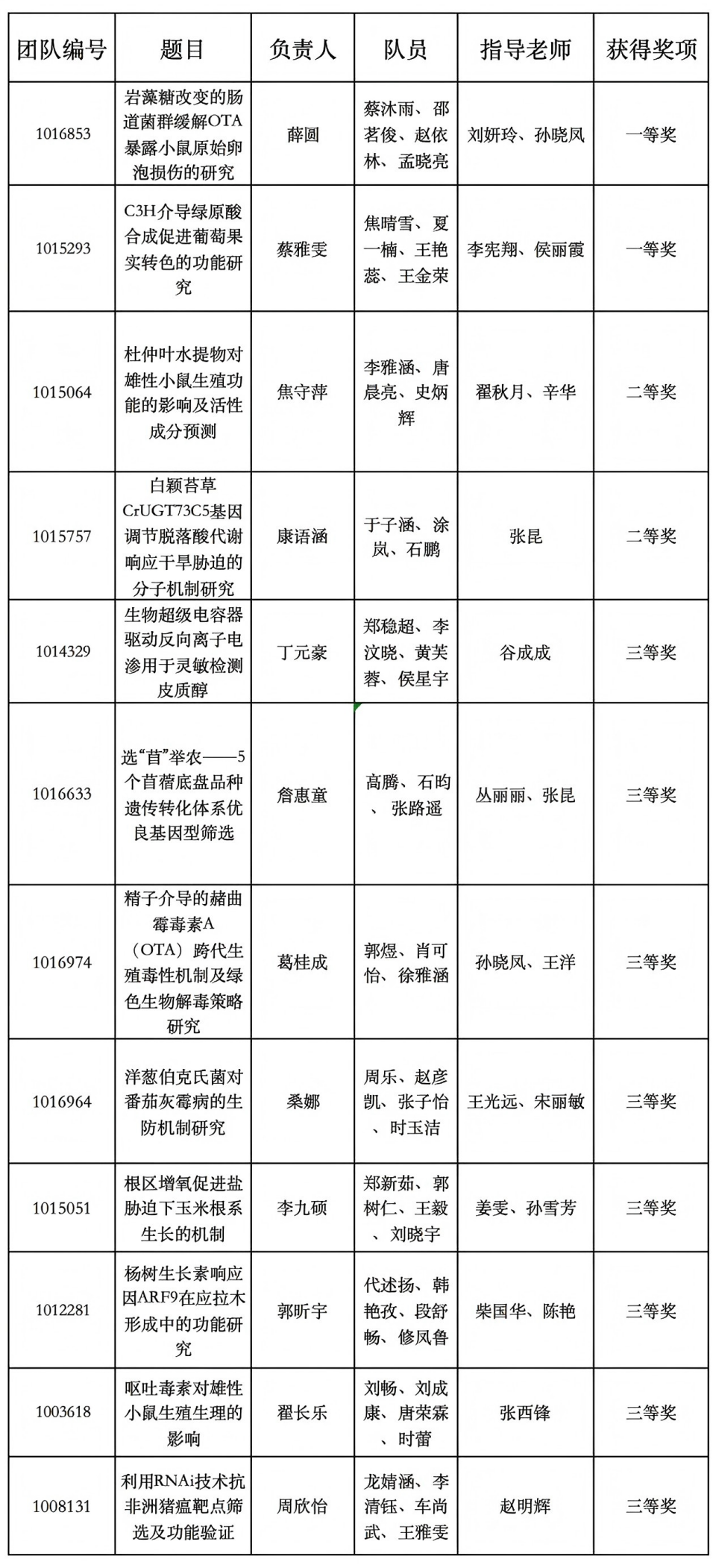 其中BEAT365唯一官网薛圆团队(指导教师:刘妍玲、孙晓凤)“岩藻糖改变的肠道菌群缓解OTA暴露小鼠原始卵泡损伤的研究”、蔡雅雯团队(指导教师:李宪翔、侯丽霞)“C3H介导绿原酸合成促进葡萄果实转色的功能研究”获得全国一等奖,焦守萍团队(指导教师:翟秋月、辛华)“杜仲叶水提物对雄性小鼠生殖功能的影响及活性成分预测”获全国二等奖。